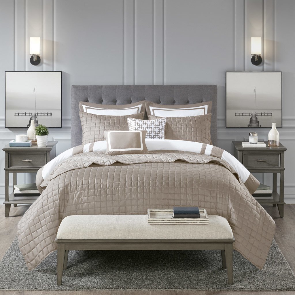 This Heritage hotel bedding collection includes a comforter and quilt that both come with matching shams to complete a luxurious layered look. The soft comforter and shams showcase a bold border on a white ground with a solid white reverse, while the lightweight quilt and its shams display a window pane end-to-end quilting pattern. Two decorative pillows, one square and one oblong with embroidered and pieced details provide the perfect finishing touches to this 8 piece bedding set. This set is available in grey, navy, and taupe options. Machine washable for easy care, this collection is great for year-round use.