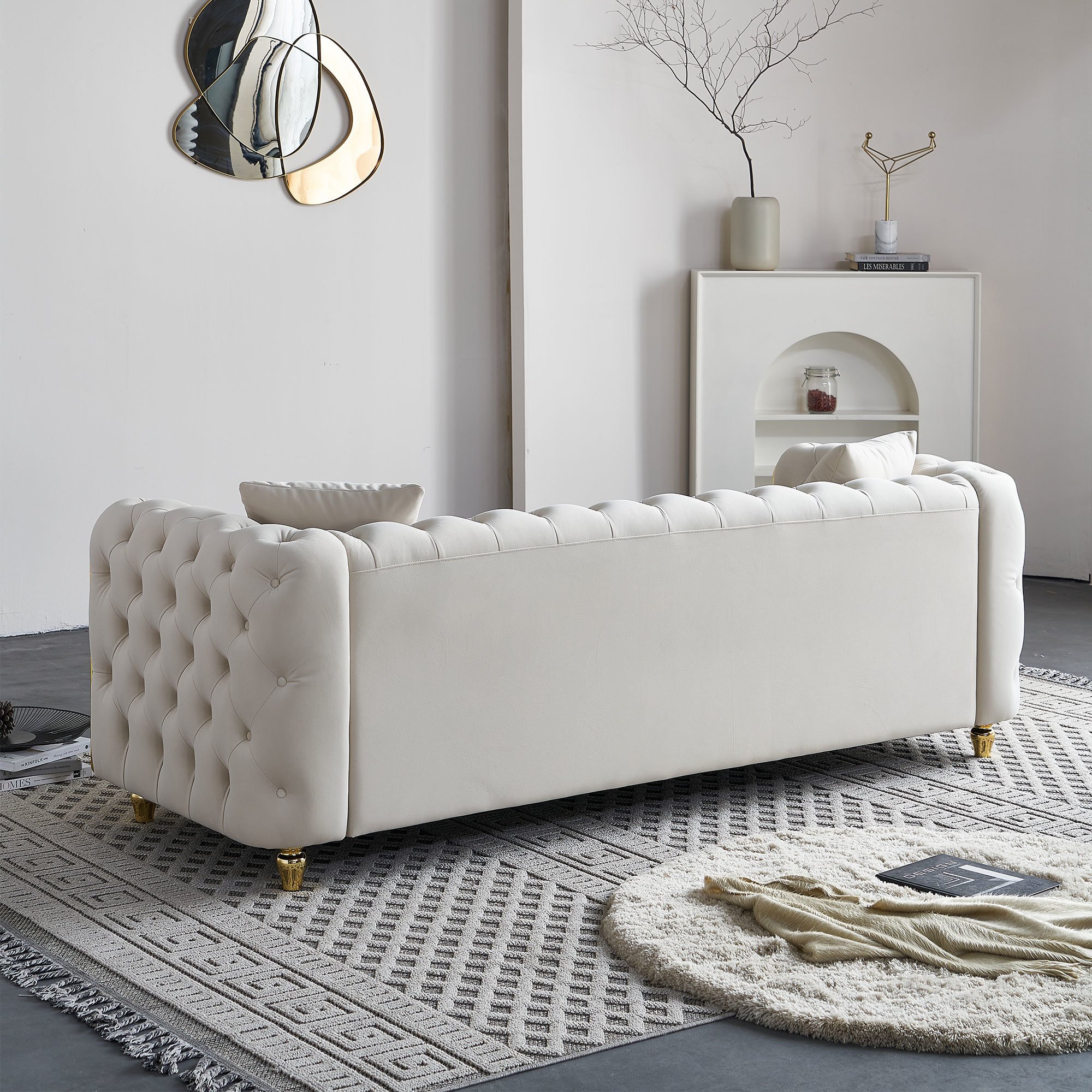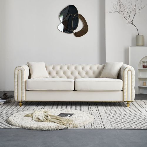 This tufted back sofa features gold strip trim and deep button tufting that adds classic glam style to your living room.