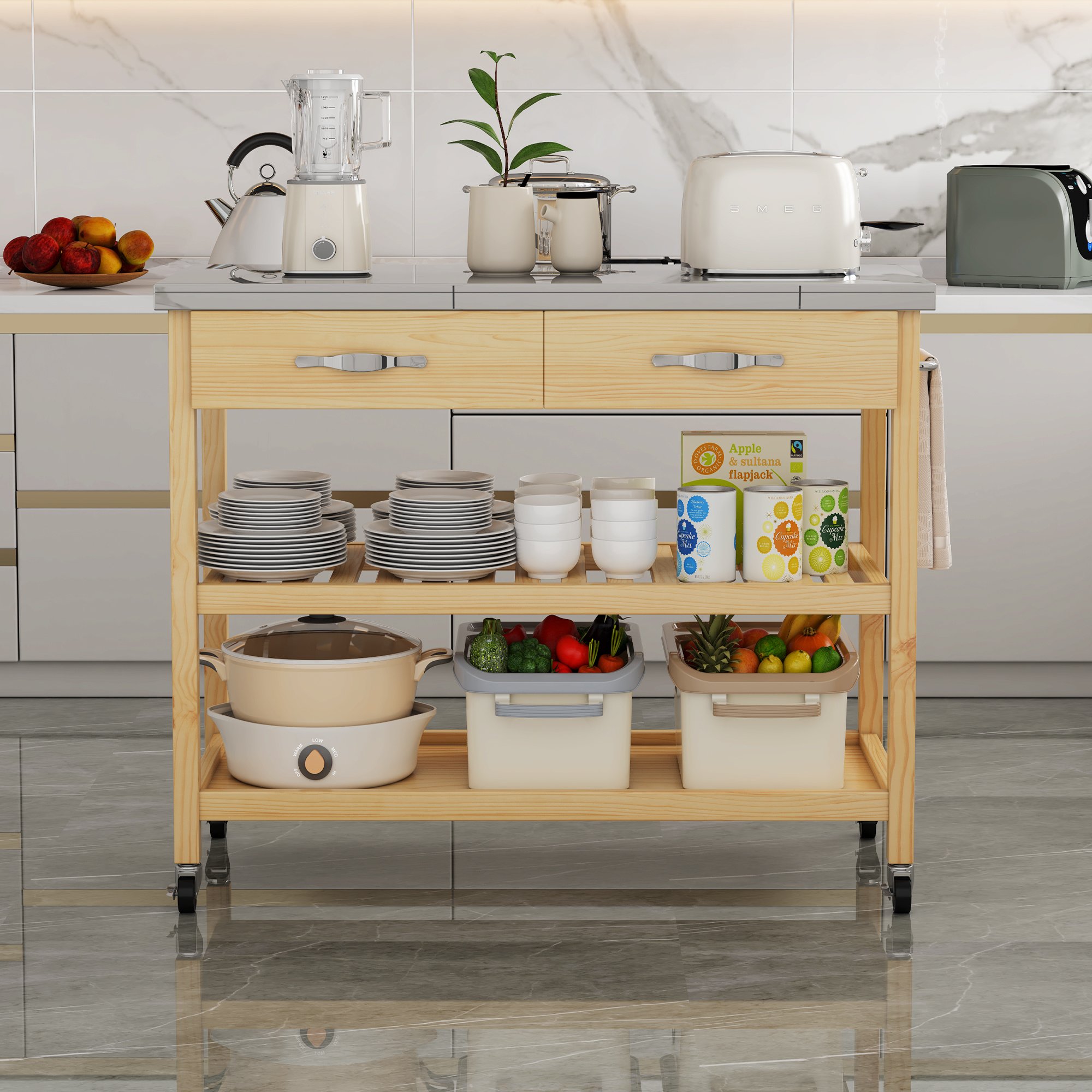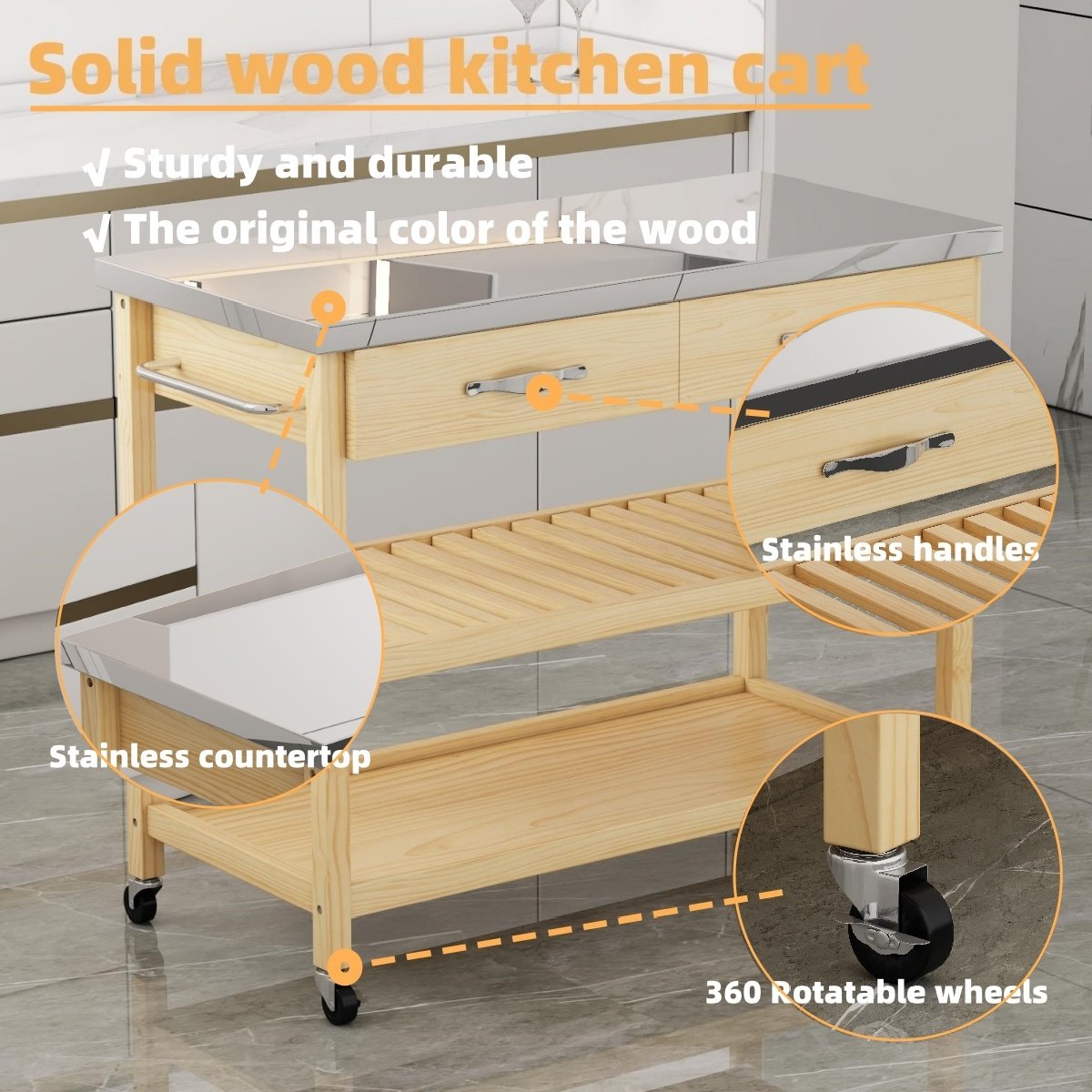 Stainless Steel Top Solid Wood Kitchen Island Rolling Utility Trolley Cart with 2 Drawer and ShelvesAdd a classic touch to your primary living space with this 3-tier rolling kitchen trolley cart which built from pine wood, topped with a stainless steel countertop, and ample storage and shelving. Featuring middle Grille shelves and 2 spacious pull-out drawers, this kitchen island cart on wheels offers storage solutions for a variety of items and utensils.
