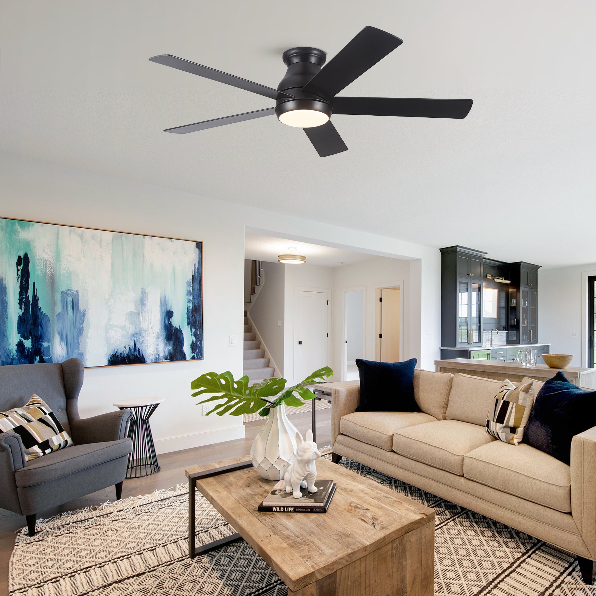 This 52 in. morden matte black low profile ceiling fans keep your space cool by YUHAO Brand combines form features a considerate design that will complement most spaces. It designed specifically for home lives, you can install in any residential or commercial space such as living room and bedroom. Hang it in a living area or family room to keep things cool in the Summer time and even reverse the motor to circulate indoor air and keep it warm in the Winter. The integrated 24-Watt LED light kit offers versatile lighting options. Choose from 3000K, 4000K or 6500K light output options all conveniently controlled with the included remote control. The 52 in. ceiling fan is energy-efficient and easy to install, so you can start enjoying the comfort.