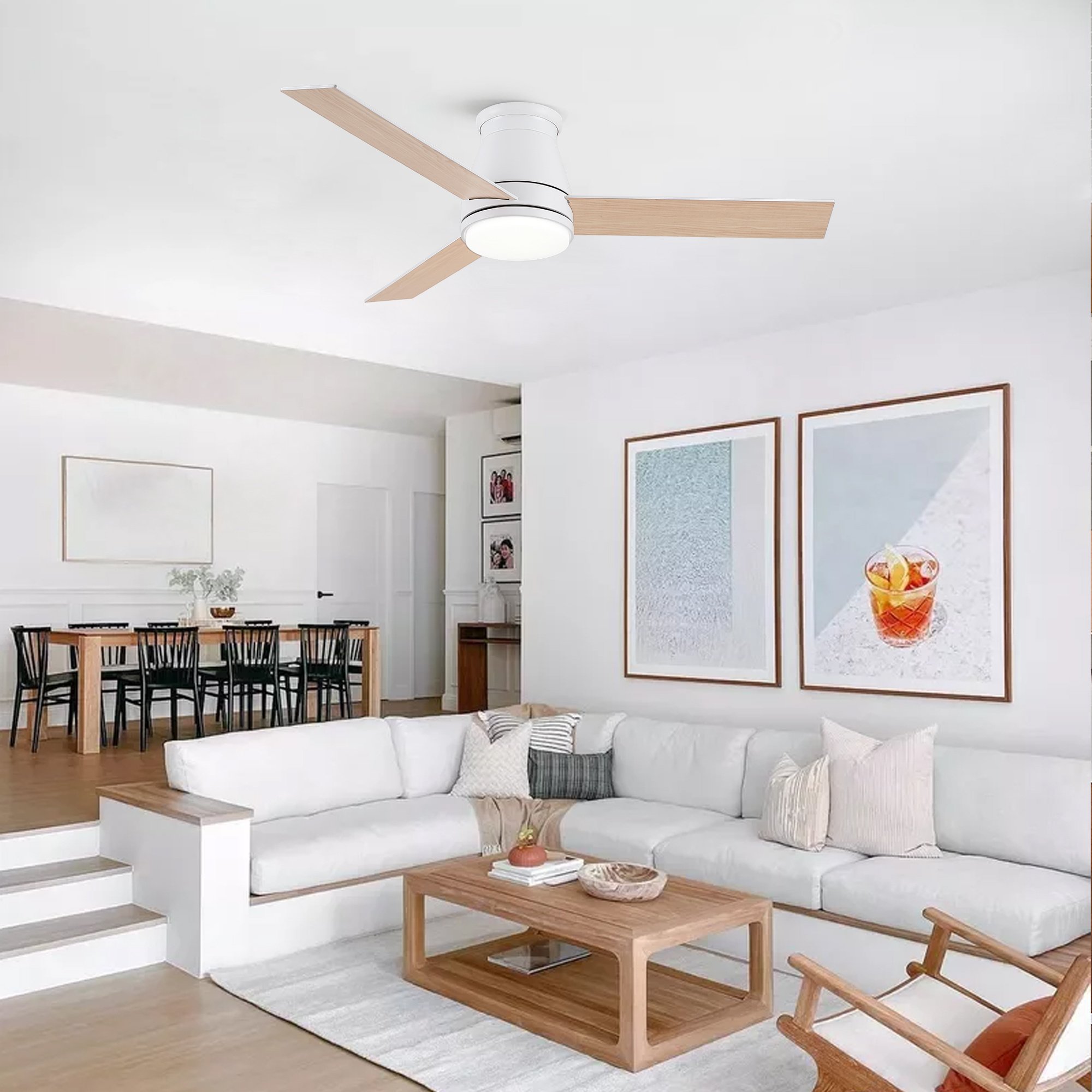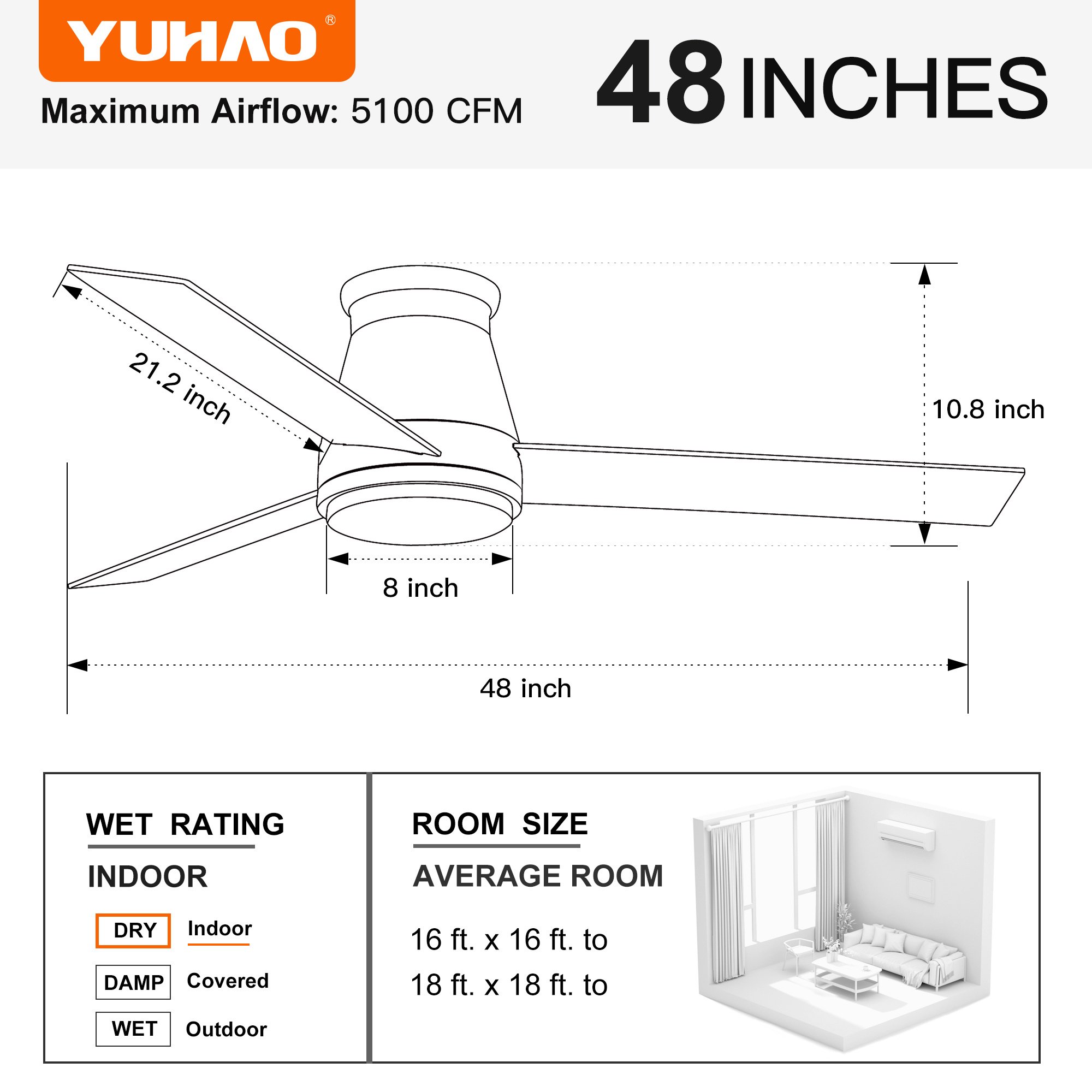 Keep your space cool with the Amici 48-Inch Modern White Low Profile Ceiling Fan from the YUHAO brand, combining form and thoughtful design to complement most spaces. It is designed for home life and you can install it in any residential or commercial space such as living room, bedroom, dining room, etc. Hang it in your living room or family room to keep it cool in the summer, or even reverse the motor to circulate indoor air and keep you warm in the winter. The blades of the ceiling fan are made of plywood and are treated with different colors on both sides, which can perfectly adapt to different home decoration styles. Use the included handheld remote to easily adjust the dimmable integrated LED lights and fan speed to create the perfect ambience. Choose from 3000K, 4500K or 6000K light output options, all conveniently controlled via the included remote. The 48-inch ceiling fan is energy-efficient and easy to install, so you can start enjoying comfort.