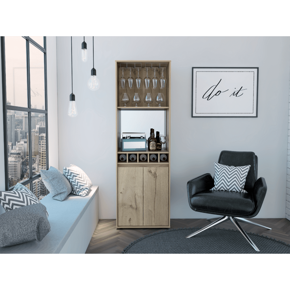 Prana Bar Cabinet, Two Shelves, Five Built-in Wine Rack, Double Door -Light Oak