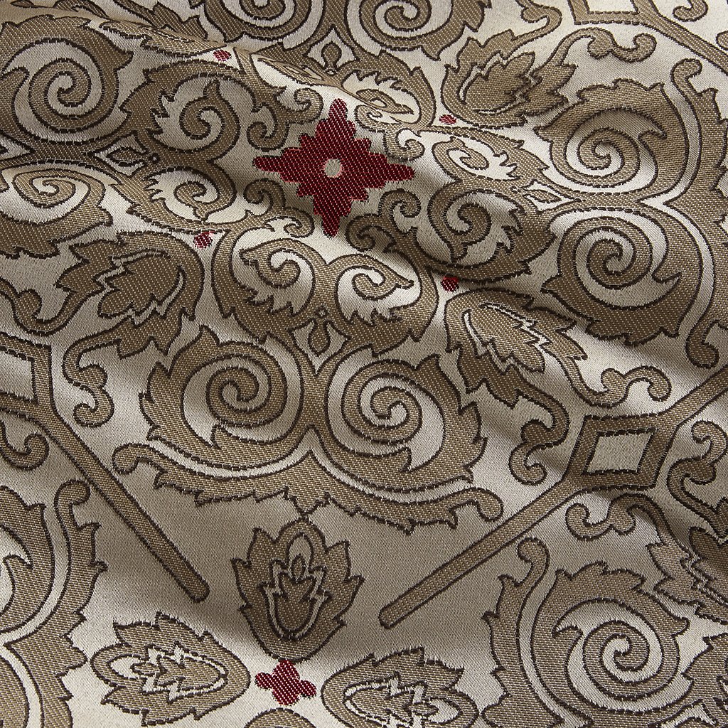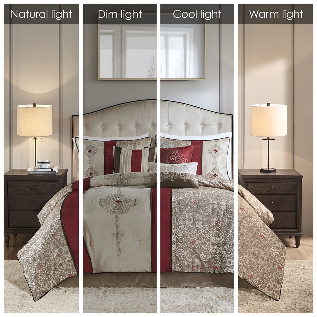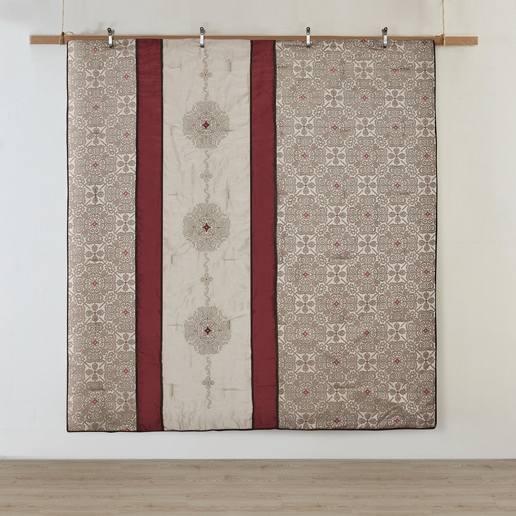 This traditional jacquard comforter features a modern color blocked aesthetic with embroidered medallion details against a lighter base color. The bold vertical stripes effortlessly draw your eyes into this beautiful comforter while the three decorative pillows further accentuate the colors and embroidered details found throughout the collection. Also include are two coordinating shams and a matching solid bed skirt which pull the whole look together. Colors found in this bed set include various shades of tan, taupe, brown while the stripe is offered in navy, red or black. This machine washable bedding set is filled with 100% polyester filling that is hypoallergenic and dustproof.
